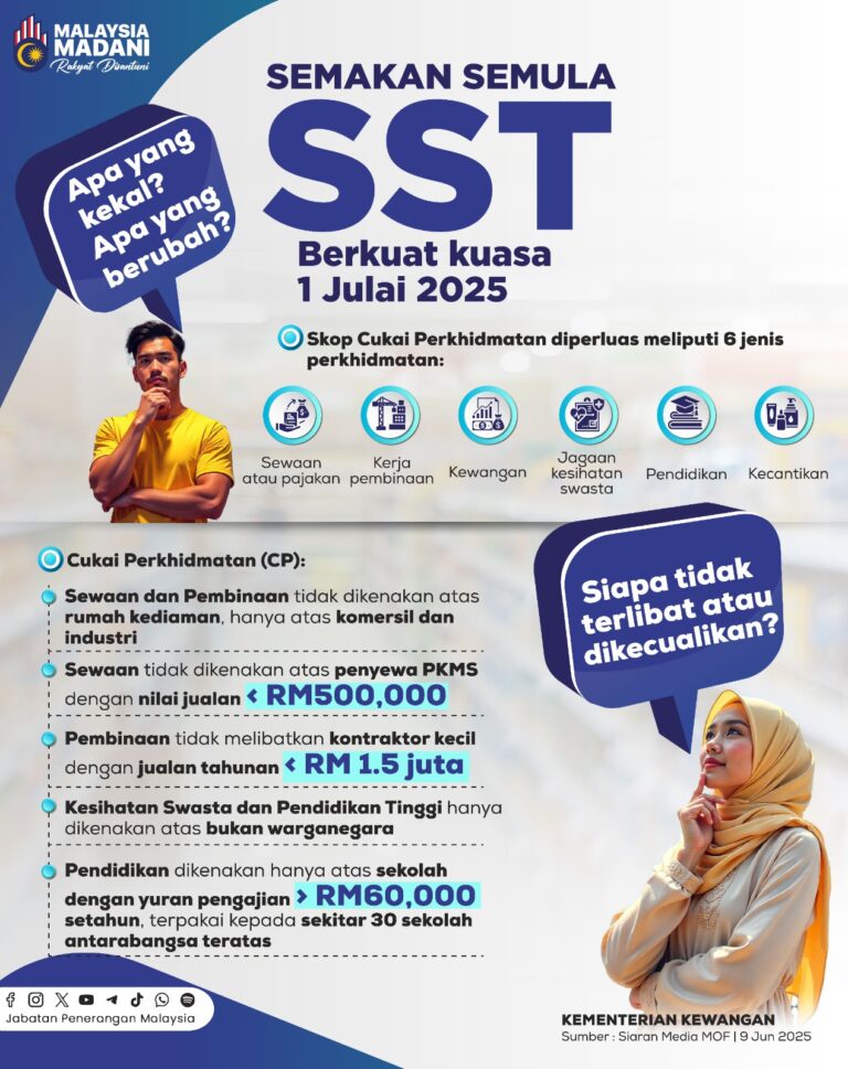 Semakan Semula SST Berkuat kuasa 1 Julai 2025 Skop Cukai Perkhidmatan Diperluas Meliputi 6 Jenis Perkhidmatan: Sewaan atau pajakan Kerja pembinaan Kewangan Jagaan kesihatan swasta Pendidikan Kecantikan